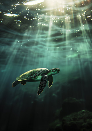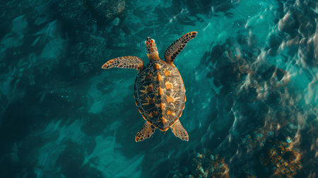 A top-down view of a sea turtle gliding through clear blue waters, with sunlight filtering through, capturing the serene beauty of marine life.