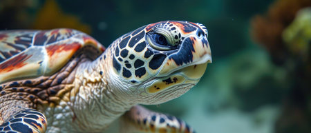 Closeup Of A Hawksbill Turtle With Scientific Name Eretmochelys Imbricata. Concept Marine Conservation, Endangered Species, Ocean Biodiversity.