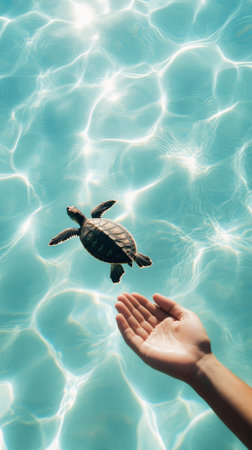 Baby sea turtle swimming in crystal clear turquoise water near open hand, creating a peaceful and eco conscious scene promoting marine life conservation and sustainability