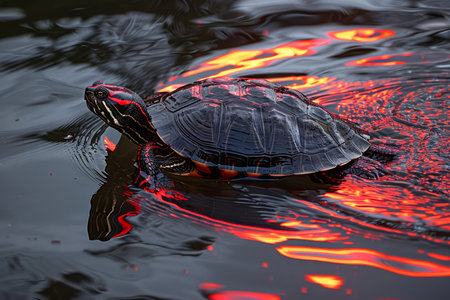 Sunlit Turtle Floating in Water With Reflective Red and Orange Sunset Ripples AI Generative