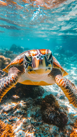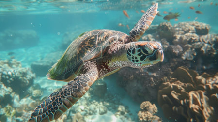 A green sea turtle swims effortlessly just above the coral reef, showing its vibrant shell and serene demeanor. Sunlight filters through the water, enhancing the colors of the sea life below.