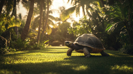 A tortoise makes its way across vibrant green grass in a tropical setting, basking in the warm sunset glow amidst palm trees.