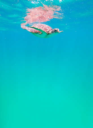 Green sea turtle swimming in the clear water of the Caribbean sea.
