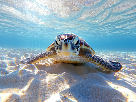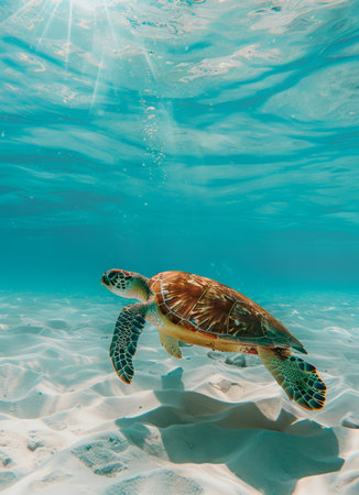peaceful scene unfolds as sea turtle glides effortlessly sandy ocean floor bathed sunlight filters water highlighting beauty marine life.