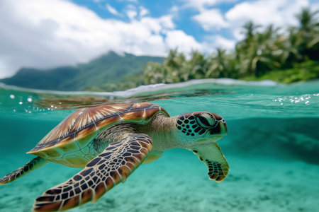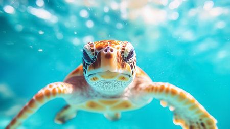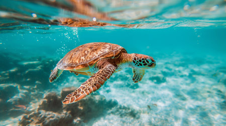 Sea turtle swimming in clear turquoise water. Marine life with sunlit underwater scene. Concept of ocean wildlife, nature, and tranquility.