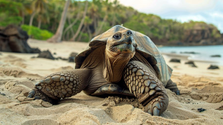 Aldabra giant tortoise on sand beach. Close-up view of turtle in Seychelles.