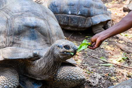 Feeding of Aldabra giant tortoise (Aldabrachelys gigantea) at Prison island. Zanzibar, Tanzania