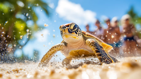 A group of dedicated conservationists is releasing rehabilitated sea turtles into their natural habitat on a sunny beach.