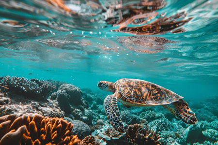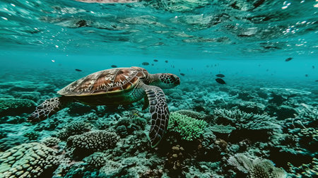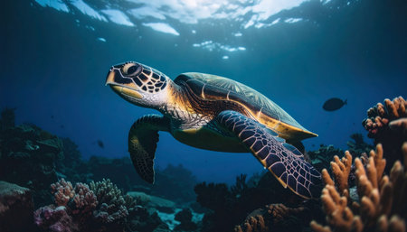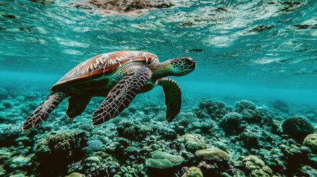 Majestic sea turtle swimming over coral reef in sunlit ocean