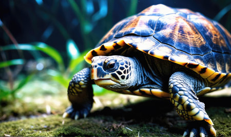 A striking close-up of a turtle nestled in vibrant greenery, showcasing its detailed features and calm demeanor, illuminated by soft sunlight in a peaceful environment.