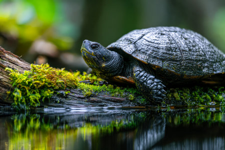 Painted turtle on a log in natural habitat, focused animal wildlife concept