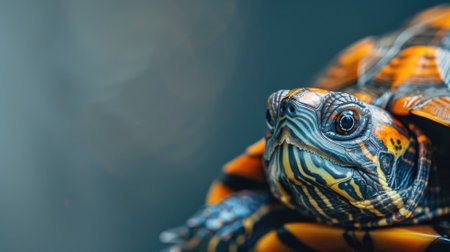 A close-up portrait of a turtle with a blurred background