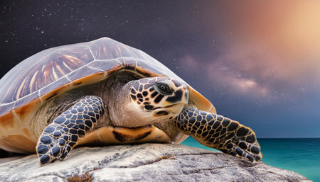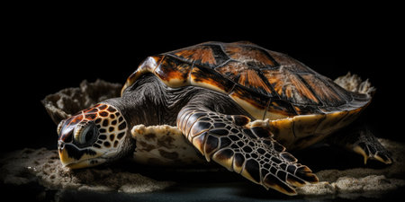 An AI generated illustration of a close-up of a turtle lying in a shell on a dark background