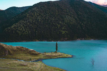 Picturesque river in green mountainous terrain. Spectacular scenery of calm river with turquoise water flowing among mountains covered with green forest