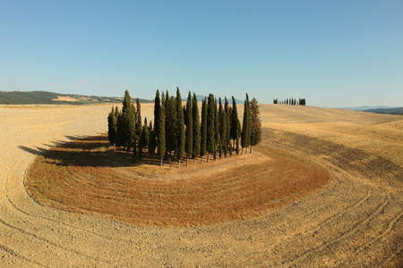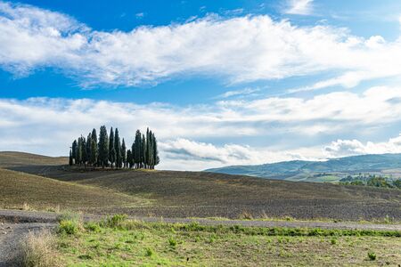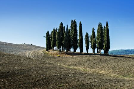 Group of cypresses in the Sienese hills in Tuscany in September