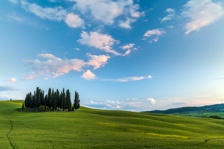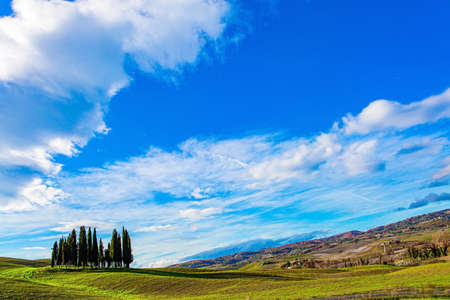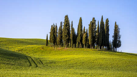Group of cypress trees in hills of Tuscany in the morning sun, Italy, April.