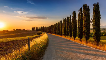 Experience the serene beauty of the Tuscan countryside at sunset, featuring cypress trees lining a winding road near Pienza, framed by vibrant skies and golden light.