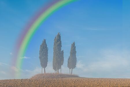 Landscape with cypress trees on field and rainbow in sky, Tuscany