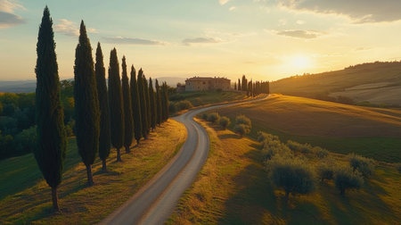 Path to hill house through cypress trees and sunrise view of stunning rural landscape of Tuscany, Italy