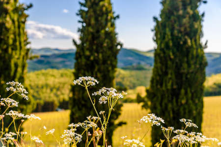 Wildflowers in front of the famous cypress trees in Tuscany Italy