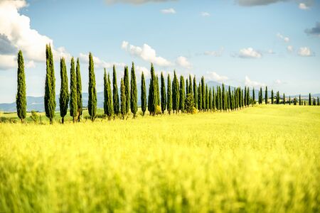 A row of cypress in Siena, Tuscany with a field of green wheat in foreground
