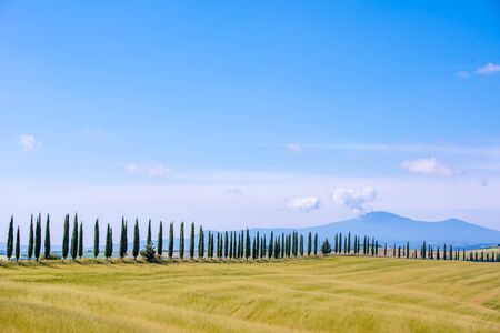 Classic Tuscan view with cypress trees. Colorful summer view of Italian countryside, Italy, Europe. Beauty of countryside concept background.