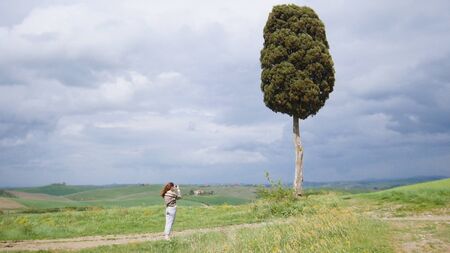 A woman takes a picture of lonely tree on the field