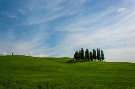 Several cypresses in the horizon on green meadows of Tuscany hills