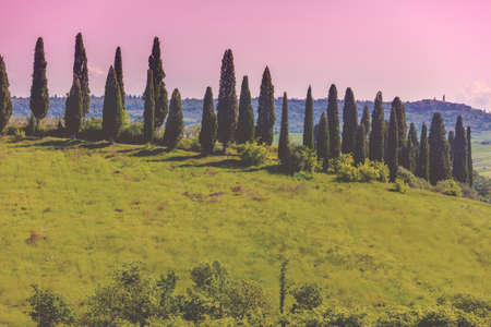 Cypress trees on the field in Tuscany, Italy at sunset. Tuscan landscape in vintage, retro mood
