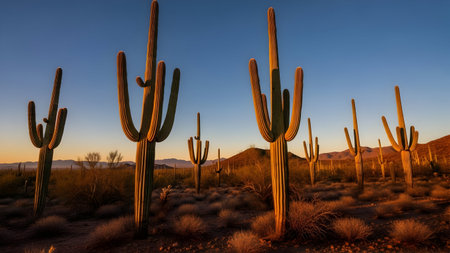 Desert landscape with saguaro cacti under clear blue sky, golden sunlight illuminating plants, iconic southwestern scene.