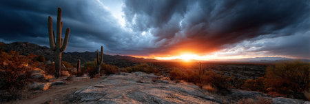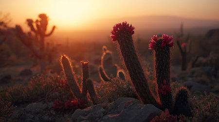 AI Generated. Serene Desert Sunset With Majestic Cacti Silhouettes
