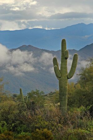 Fog hovering over the mountains of central Arizona with Saguaro cactus and other desert plants