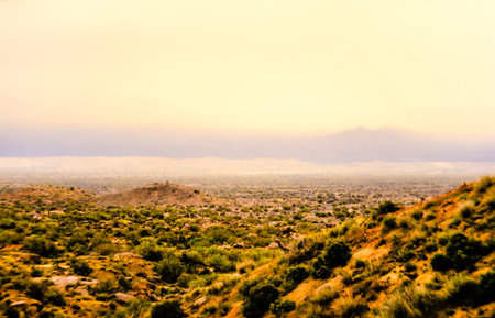 Arizona southwest desert scrub brush with hazy mountains in the background under a bright hazy yellow sky.