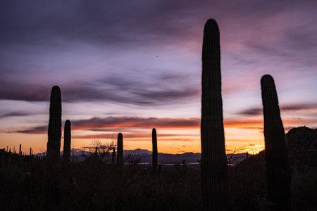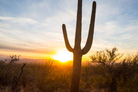 Silhouette at Saguaro cactus at Sunset in Sonoran desert in Phoenix, Arizona, USA