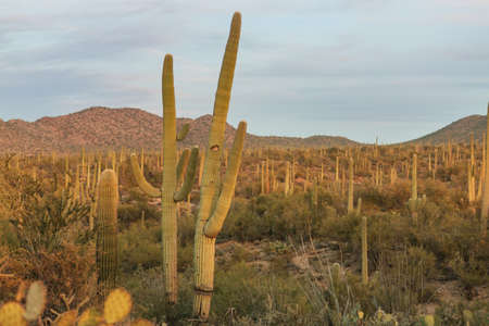 Prickly Pear and Saguaro Cactus in front of subtle sunset in Sonoran desert