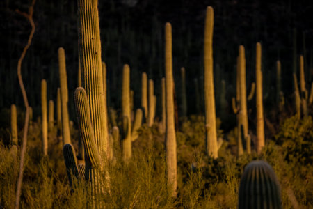 Trunks Of Saguaro Catch Golden Light At Sunset in Saguaro National Park