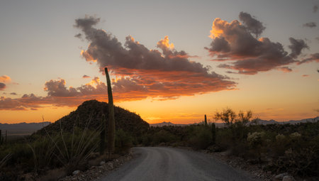 Clouds Glow Orange Over Hohokam Road In Saguaro National Park
