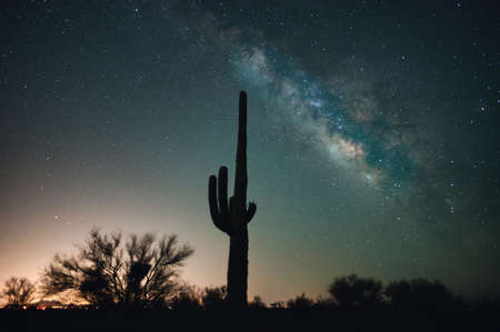Captivating nocturnal landscape with the milky way galaxy and cactus silhouettes under a meteor shower