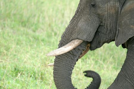Detail of the head and an elephant tusk. Africa. Kenya. Tanzania. Serengeti. Maasai Mara.