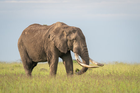 A large elephant with white tusks in the wild savannah, the layer is moving forward.