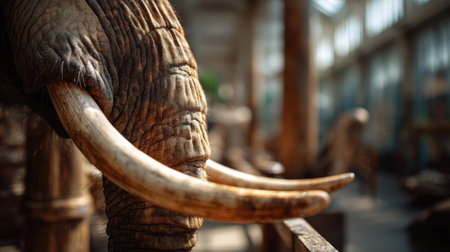 A stunning close-up captures the intricate textures of an elephant's skin and impressive tusks set within a natural history exhibit. Perfect for wildlife enthusiasts.