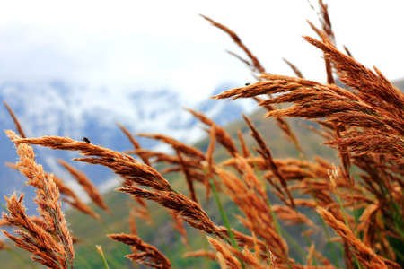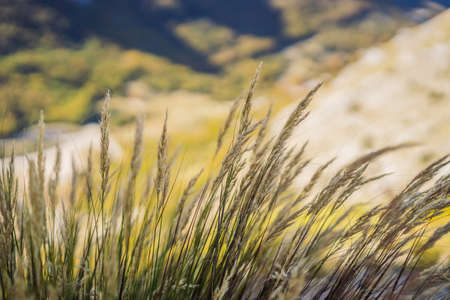 Selective soft focus of dry grass, stems blowing in the wind at golden sunset light. Nature, summer, grass concept.