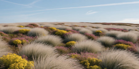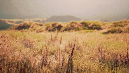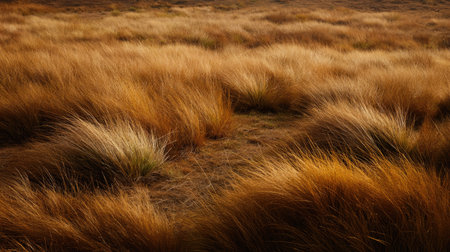 A serene view of golden grasses softly rippling in the breeze, perfectly capturing the beauty of an untouched landscape. Ideal for nature and outdoor themes.