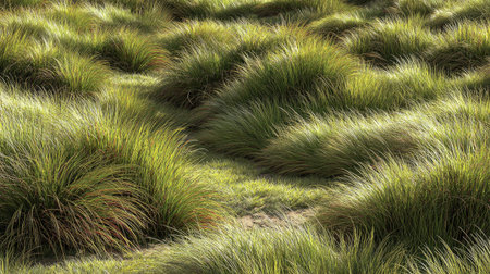 Expansive view of lush green grassland with rolling hills, showcasing vibrant blades of grass swaying gently in the breeze under bright sunlight. Ideal for nature themes.