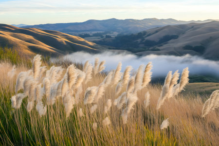 Pampas grass swaying in the wind on a foggy hilltop at sunrise with golden light, overlooking a valley with rolling hills and low clouds