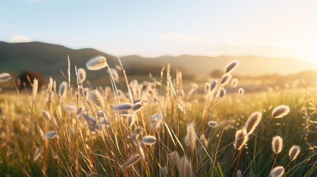Tall grasses dance in a warm breeze, illuminated by the golden hues of late afternoon light. The peaceful landscape invites tranquility and reflection amidst natures beauty.