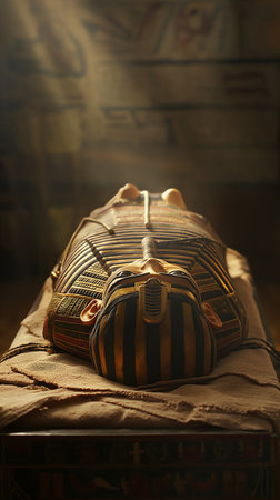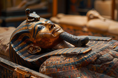 Mummy of an Egyptian pharaoh lying in sarcophagus