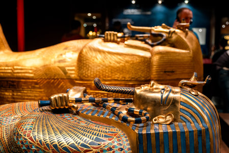 Bratislava, Slovakia - November 15, 2025: Detailed view of a golden sarcophagus and funerary mask inspired by ancient Egyptian burial traditions at the Tutankhamun exhibition.