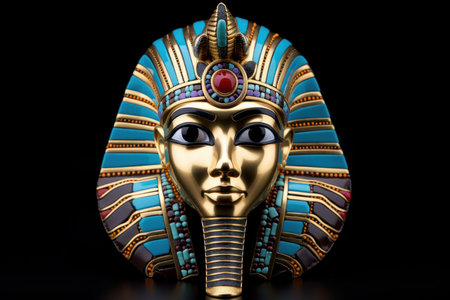 Golden funerary mask of pharaoh Tutankhamun with vivid blue red and turquoise inlays on black background