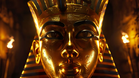 Golden Pharaoh Mask Illuminated by Warm Sunlight with Ancient Egyptian Details. High quality photo